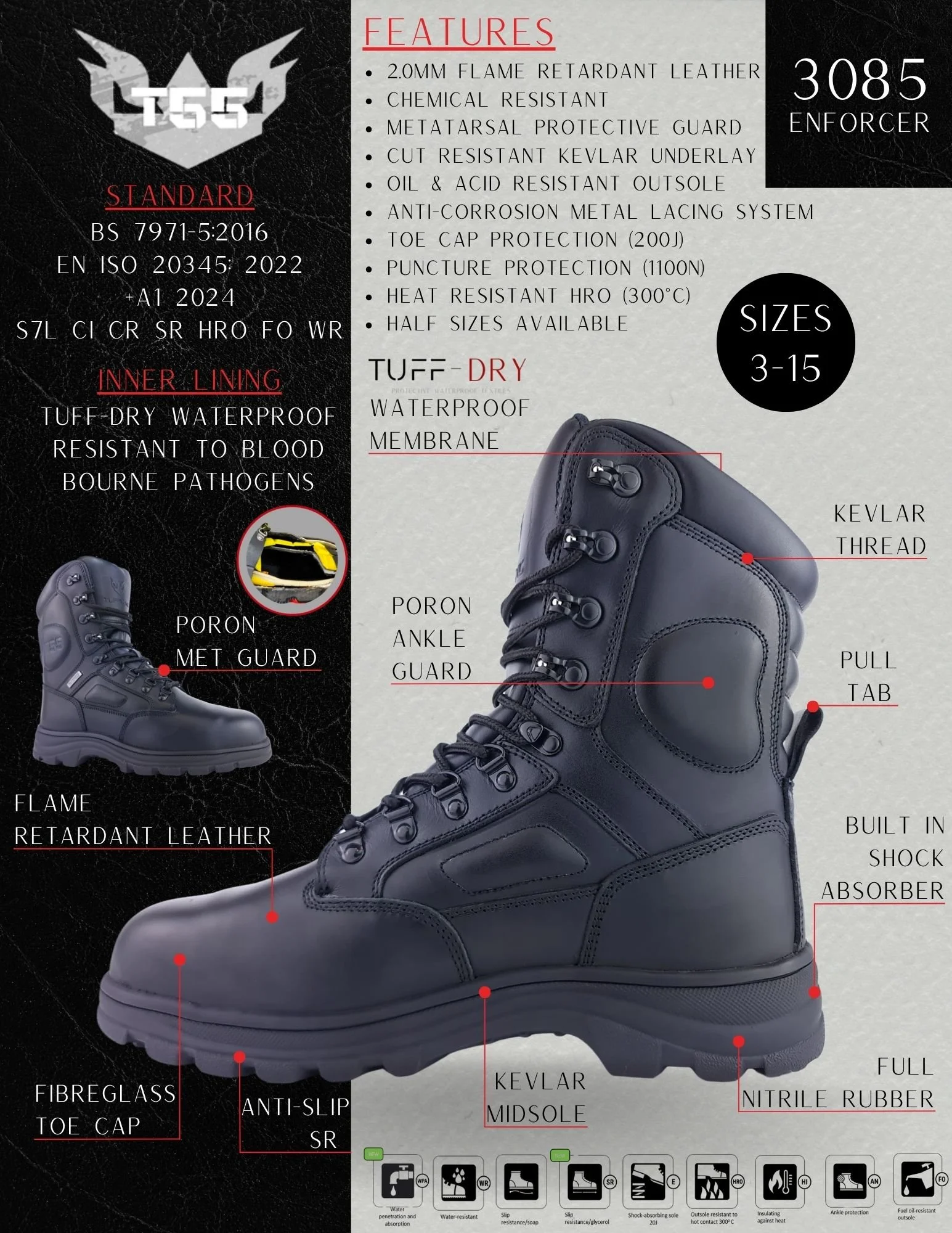 The Tuffking Enforcer is a high-performance safety boot designed for extreme conditions. Made from 2.0mm flame-retardant, cut-resistant genuine goatskin leather, it features a waterproof membrane, Kevlar thread, and a built-in shock absorber for comfort. The boot includes a metatarsal guard, ankle guard, fiberglass toe cap (200J), and puncture-resistant Kevlar midsole (1100N). Its nitrile rubber outsole is oil, acid, and slip-resistant, with heat resistance up to 300°C (HRO). Ideal for hazardous environments.