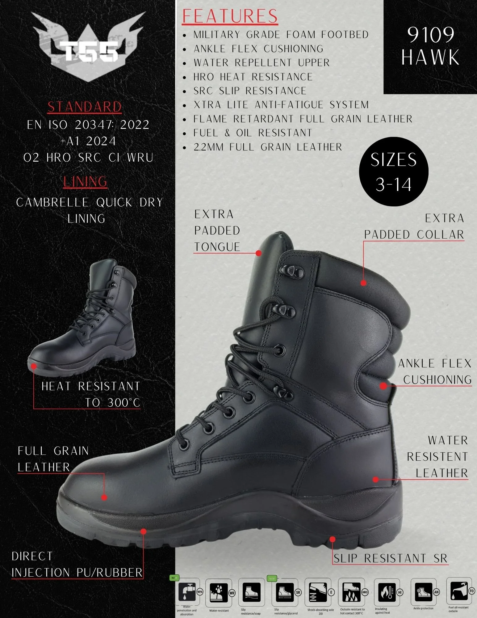 The Tuffking Hawk is a high-performance tactical boot designed specifically for police forces and law enforcement professionals. Crafted with flame-retardant genuine leather, the water-resistant upper repels moisture, ensuring long-lasting durability in all conditions.