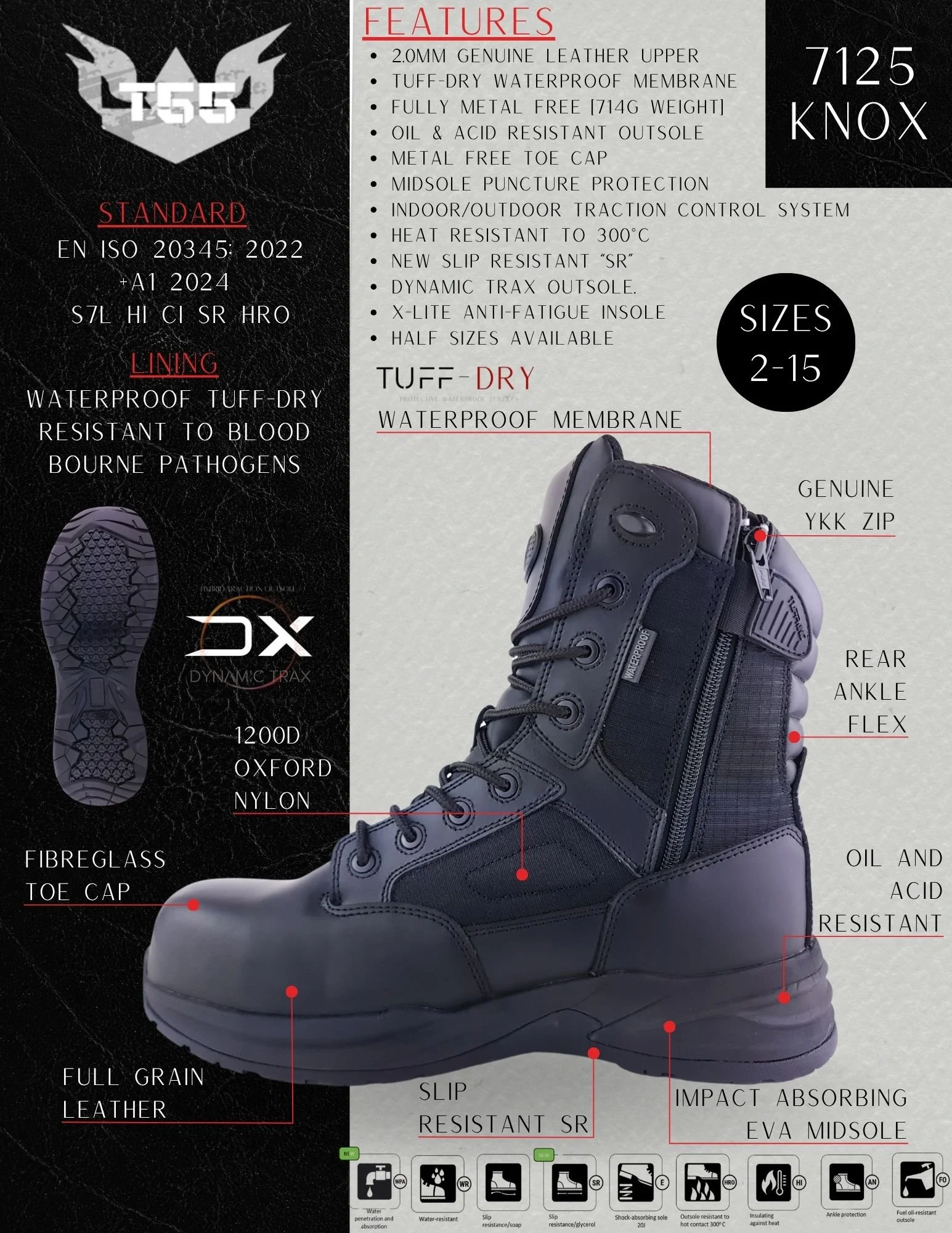 To ensure the boots withstand the unpredictable conditions of emergency services, the Tuff-Dry® Recycled Waterproof Membrane is incorporated into the boot. This eco-friendly technology not only keeps feet dry during wet conditions but also contributes to sustainability, making the Tuffking Knox a great choice for those committed to environmental responsibility.